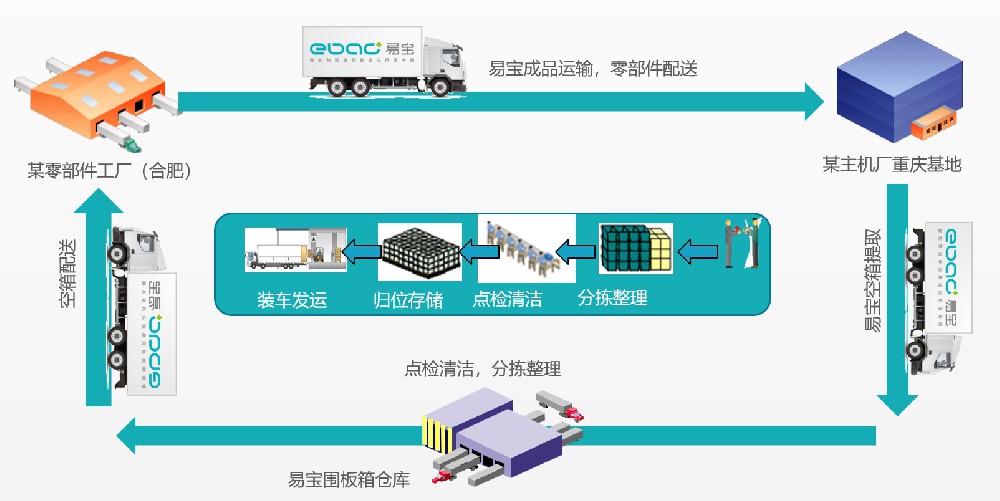 宁波神通围板箱租赁项目(余姚—北京—余姚):• 围板箱由易宝提供租赁与包装设计• 负责将成品从宁波神通运输到北京宝沃工厂• 负责在北京宝沃工厂领取空箱和内衬• 负责空箱与内衬的清洗、清洁、整理、储存、对账• 负责将空箱与内衬返空运输到客户宁波神通 合肥爱德夏围板箱租赁项目(合肥—重庆—合肥) :• 围板箱由易宝提供租赁与包装设计。• 负责将成品从宁波神通运输到重庆福特三方库• 负责在重庆福特三方库领取空箱和内衬• 负责空箱与内衬的清洗、清洁、整理、储存、对账• 负责将空箱与内衬返空运输到客户合肥工厂 常州贺尔碧格KLT箱租赁项目(保定—常州) :• KLT箱和托盘由易宝提供租赁与包装设计。• 负...