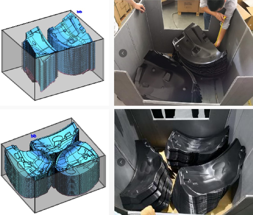 前横向传动轴改善 问题点:1、零件放置无明显间隔,易移动磕碰;2、包装在其他零件上面,不方便转运;3、防锈膜缠绕,包装及拆取不便。解决措施:1、设计专用纸卡+重型纸箱包 装,保证零件相互无接触;2、使用小尺寸托盘单一品种包装,省去客户分拣工序,利于线边生产作业;3、使用防锈袋,保证效果,方便作业。成效展示:物流成本降低38.43%。 问题点:1、发动机托架水平放置,之间使用气泡膜隔开,气泡膜缓冲力度不大,容易产生磕碰;2、零件铺 底,与其他零件混装,不方便客户分拣。解决措施:1、设计专用纸卡+ 重型纸箱包装,保证零件相互无接触;2、使用小尺寸托盘单一品种包装,省去 客户分拣工序,利于线边生产作业。成效展示:物流成本降低42.58%。